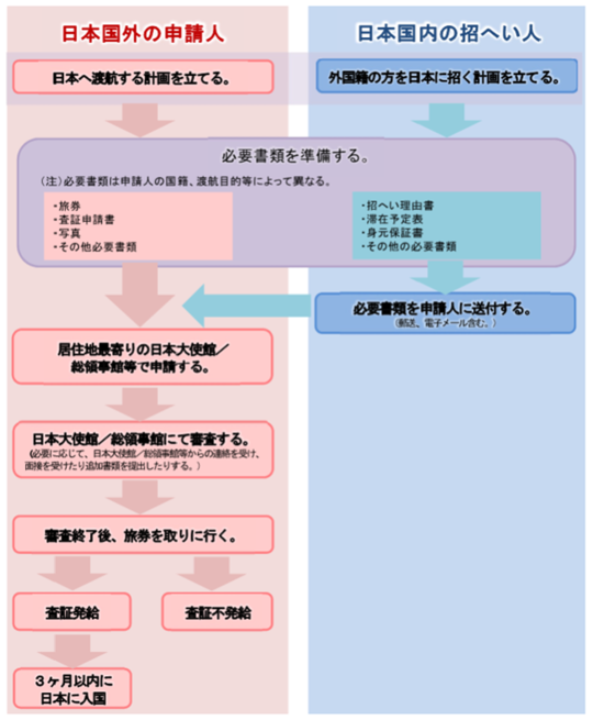 短期滞在ビザの申請手続きは、複雑で分かりにくいと感じる方も多いかもしれません。そこで、外務省のHPに、一般的な申請の流れが分かりやすく示されていましたのでご紹介します。この図で全体の流れをつかんでみましょう。