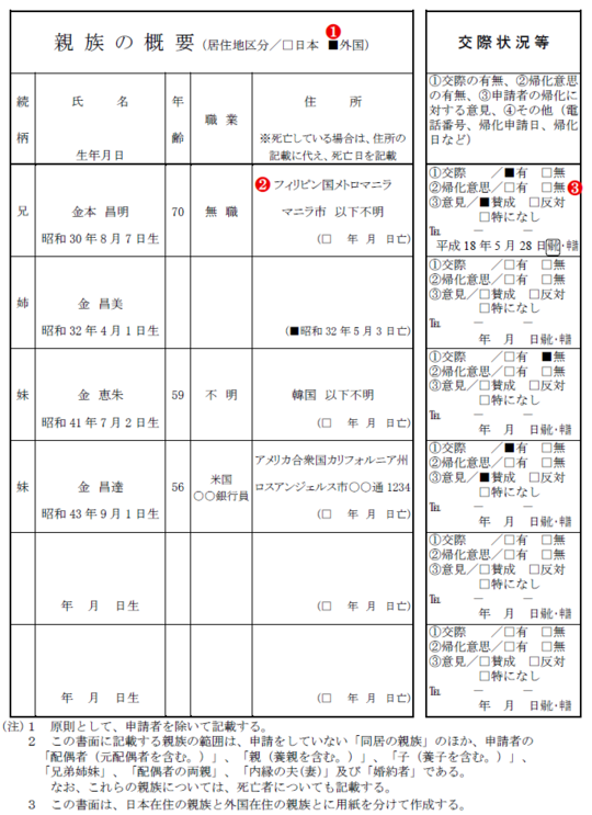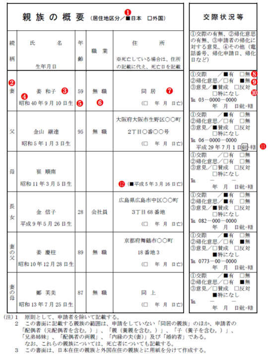 それでは早速、親族の概要の記載例(出典:帰化許可申請のてびき)を見ながら、注意すべきポイントについて、確認していきましょう。