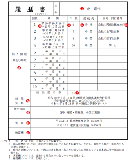 それから、履歴書その2には出入国歴を記載しますが、その対象期間は申請者によって異なります。詳しくは後述しますが、自分の対象期間を確認してから作成しましょう。