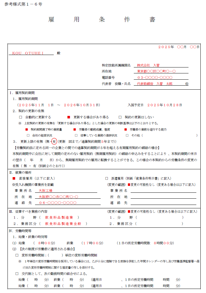 ※今回は、海外にいる外国人を1号特定技能外国人として雇用するために作成した雇用条件書の記載例です。