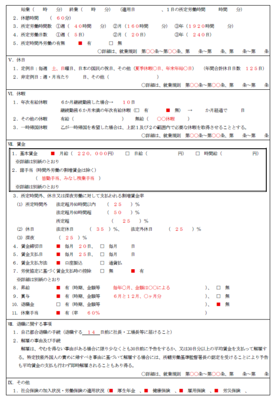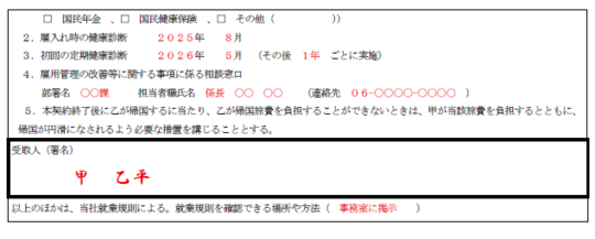 上記条件を網羅した内容の雇用条件書を作成する必要があります。なお、特定技能ビザの場合、入管が提供している参考様式がありますので、そちらを使って漏れ無く作成すれば、網羅できます。