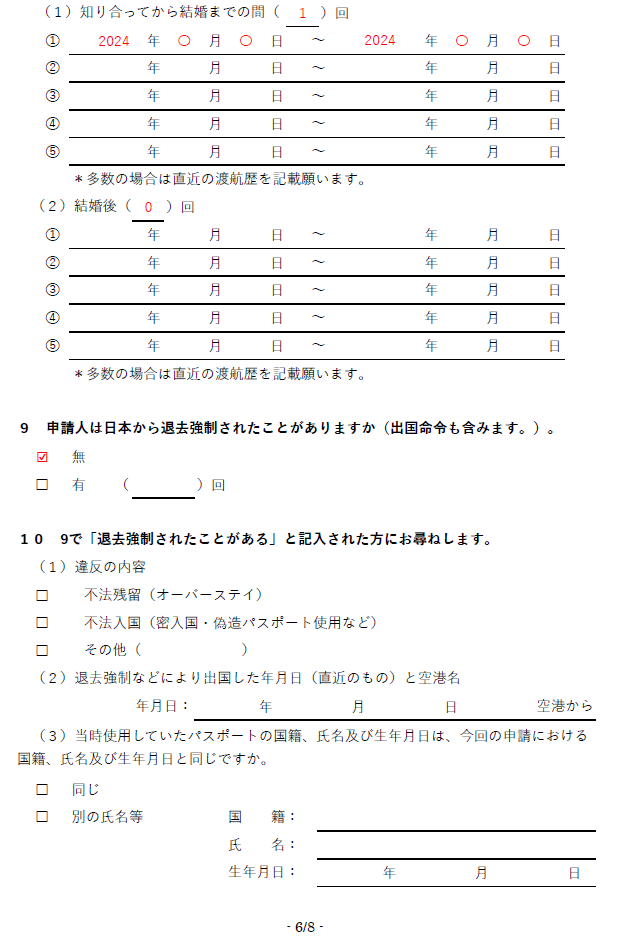配偶者の来日の回数と時期についても、配偶者のパスポートを確認し、正確に記載します。なお、知り合ってから結婚までの間とは、国際結婚の手続きを日本又は海外のどちらかで先に成立させた日より前に渡航したものが対象期間となります。つまり、海外で先に国際結婚の手続きをするために渡航した場合も、知り合ってから結婚までの間に含めるということです。