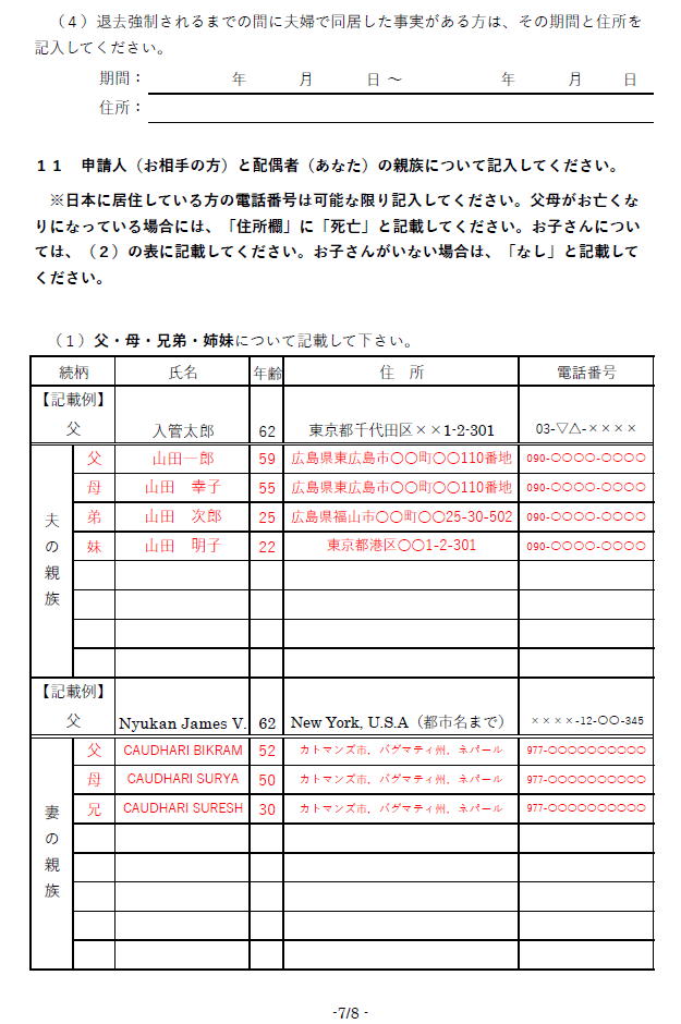 2人の結婚について、知っている親族に〇を付けます。基本的には、生存している親族全員に知らせるはずですので、全員に〇を付けることができると思います。ここで、もし〇が付いていない親族がいれば、入管は疑義を持つことになります。結婚に反対している親族がいるとしても、必ず知らせましょう。