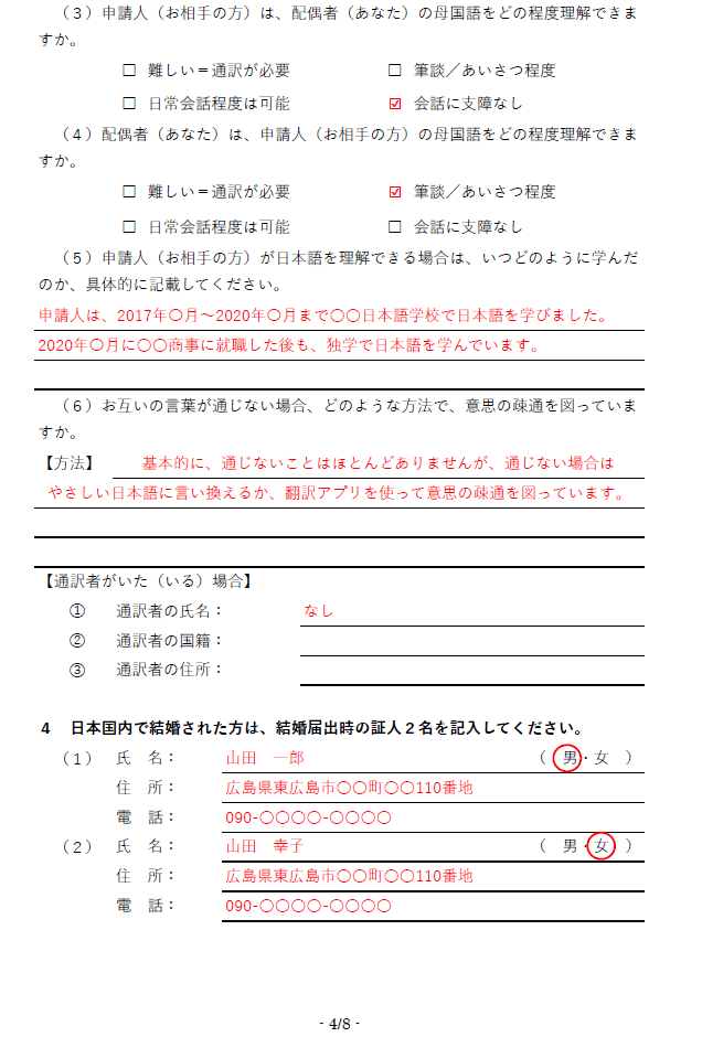 国際結婚を先に日本で成立させた場合は、結婚届出時の証人2人の詳細情報を記載します。一般的には、両親や兄弟姉妹が証人になるケースがほとんどだと思います。逆にそうでない場合、なぜ親族ではないのかと入管に疑われる可能性があります。電話番号は、固定電話でも携帯電話でもどちらの番号でも大丈夫です。